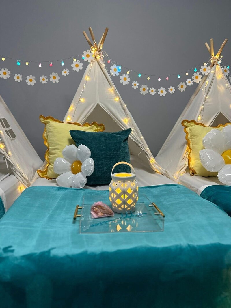 Each guest has a cozy teepee set with bedding, lights, pillows, and matching details.